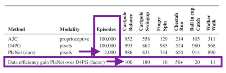 来自论文:“PlaNet解决了各种基于图像的控制任务,在性能方面与先进的无代理模型比较,平均效率提高了5000%······这些学习动态可以独立于任何特定任务,因此有可能很好地迁移到环境中的其他任务。”
