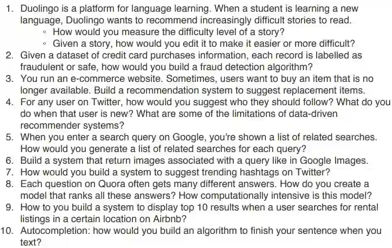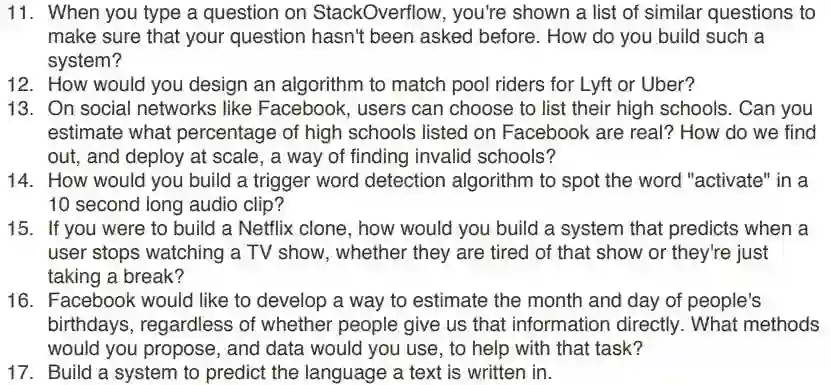 阅读这些案例可以学到如何在生产环境中克服种种部署要求和约束。Airbnb、Lyft、Uber、Netflix 等很多公司都开设了博客来介绍自己使用机器学习改进产品或生产流程的经验。需要面试的小伙伴可以经常浏览这些博客。本教程介绍了其中的一些精华案例,包括: