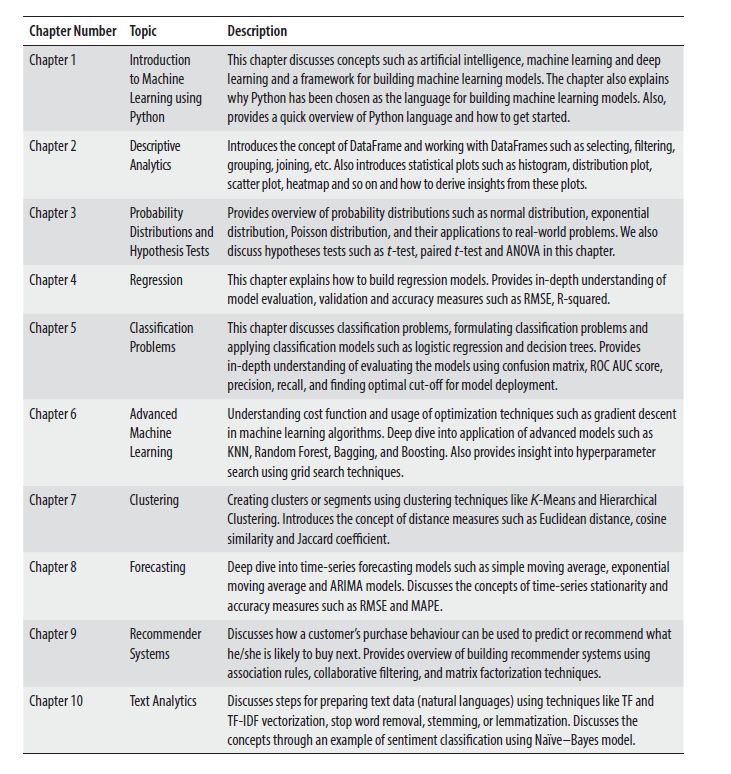 本书通过提供真实的案例研究和示例,为使用Python库进行机器学习提供了坚实的基础。它涵盖了诸如机器学习基础、Python入门、描述性分析和预测分析等主题。包括高级机器学习概念,如决策树学习、随机森林、增强、推荐系统和文本分析。这本书在理论理解和实际应用之间采取了一种平衡的方法。所有的主题都包括真实世界的例子,并提供如何探索、构建、评估和优化机器学习模型的逐步方法。
