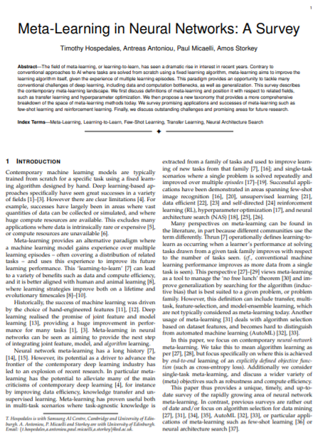 元学习提供了另一种范式,机器学习模型可以在多个学习阶段获得经验——通常覆盖相关任务的分布——并使用这些经验来改进未来的学习性能。这种“学会学习”[8]可以带来各种好处,如数据和计算效率,它更适合人类和动物的学习[9],其中学习策略在一生和进化时间尺度上都得到改善[10,9,11]。机器学习在历史上是建立在手工设计的特征上的模型,而特征的选择往往是最终模型性能的决定因素[12,13,14]。深度学习实现了联合特征和模型学习的承诺[15,16],为许多任务提供了巨大的性能改进[1,3]。神经网络中的元学习可以看作是集成联合特征、模型和算法学习的下一步。神经网络元学习有着悠久的历史[17,18,8]。然而,它作为推动当代深度学习行业前沿的潜力,导致了最近研究的爆炸性增长。特别是,元学习有可能缓解当代深度学习[4]的许多主要批评,例如,通过提供更好的数据效率,利用先验知识转移,以及支持无监督和自主学习。成功的应用领域包括:小样本图像识别[19,20]、无监督学习[21]、数据高效[22,23]、自导向[24]强化学习(RL)、超参数优化[25]和神经结构搜索(NAS)[26, 27, 28]。