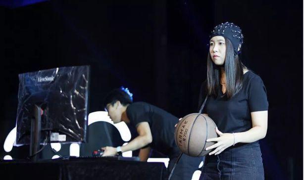 在峰会现场,布润科技研发的脑机接口(BCI)"脑控"机器人可与一位现场观众比赛打篮球的同时控制小赛车穿越障碍,并且可确保零误差将人的想法转换成机器控制指令最终胜出。
