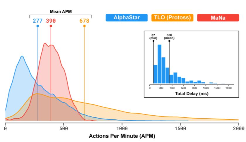 尽管如此,AlphaStar并没有如人们想象的那样,从优势中获得大的收益。虽然在理论上TLO和MaNa在游戏中的APM不如AI快,但AlphaStar实际上每分钟执行的操作数比他的人类对手还少,并且明显少于普通职业玩家的操作次数。AI也有大约350毫秒的反应时间,显然这比大多数职业玩家要慢。不过,整体来看,虽然人工智能花费了更多时间,但却能够做出更聪明,更有效的决策,从而更占优势。