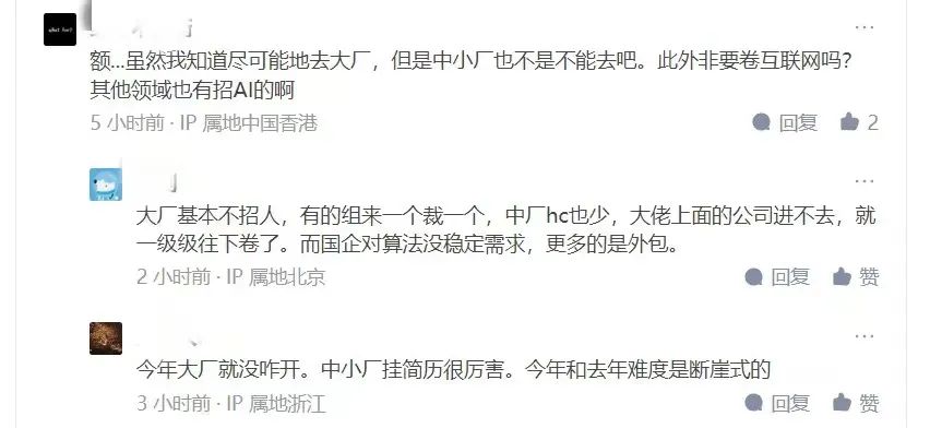还有目前在哈工大计算机硕士在读的网友表示,「正在亲身经历秋招,大厂技术类岗位缩减70%,竞争难度翻倍。同等学历就业情况一年不如一年。」