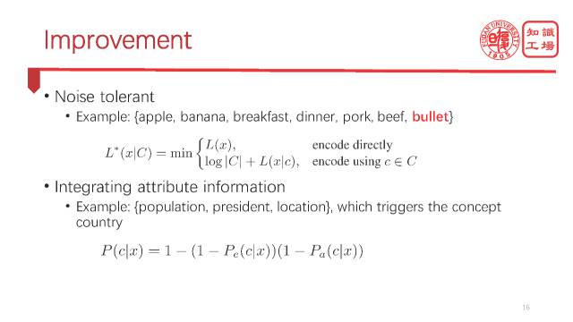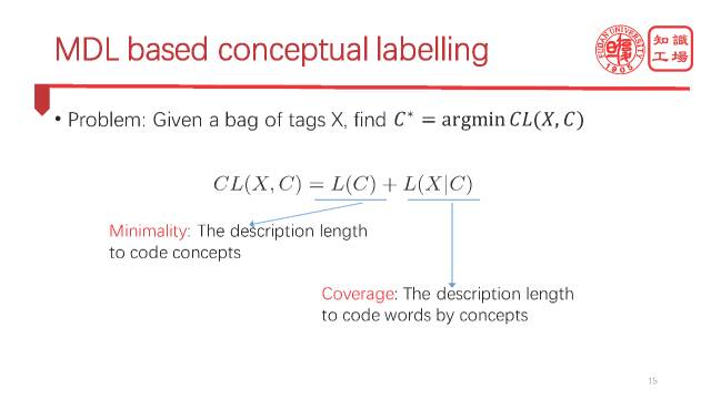 我们把刚才那个概念标签选择问题建模成找一堆概念来encoding我们看到的tag这么一个问题。那么很显然,刚才的两个标准,就可以体现在这里的两个目标里。第一部分,就是我们要用尽可能少的概念去cover这些实例,那么也就是说概念自身的编码代价要尽可能小。第二个利用这种概念去encoding知识图谱的tag的代价尽可能小,也就是基于知识图谱的条件的length尽可能小。就有这么一个优化的问题。当然了,这是一个很general的model。在这个general的model下面,我们还要处理一些很实际的情况。