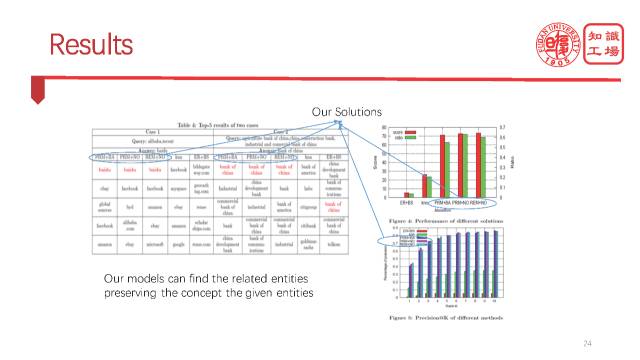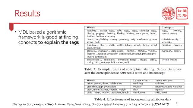 最终的实际效果大家看,非常有意思。我们可以看到,基于MDL的方法是可以非常有效的解释这个标签的。我们人为做了一个实验,把来自三组不同概念的实体混在一起,看看我们的模型能不能找到这三组实体的三个正确的概念标签。图中Table 3第一行就真的找到相应来源的概念。