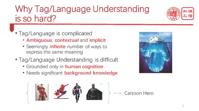 那么再进一步分析为什么语言理解这么困难?从根本上来讲,是因为语言理解是建立在人对世界认知的基础之上。你为什么能够理解语言?是因为你已经对这个世界,对在你身边发生的事情有了充分的认知。机器现在还达不到认知世界的能力,机器的大脑里还缺乏非常重要的背景知识,比如这里有几个卡通人物,大家一看就理解了,那是因为你已经有这个背景知识在背后,那么机器想要理解语言,理解标签,就需要有海量的背景知识去支撑它认知这些概念。