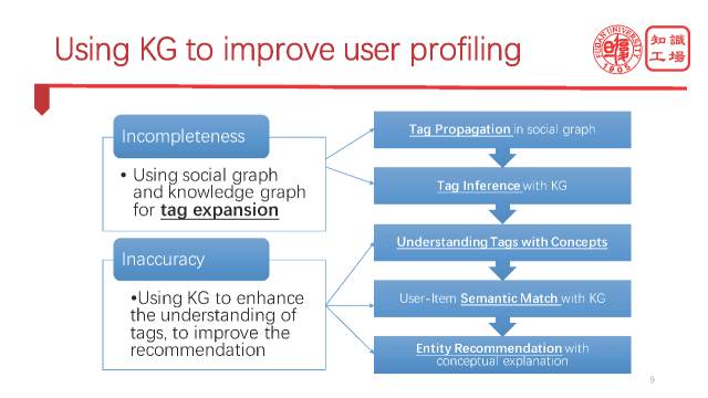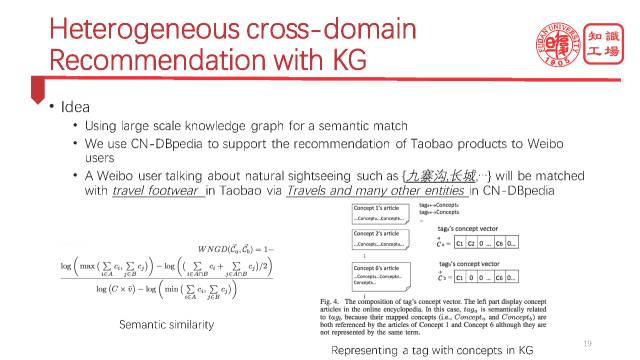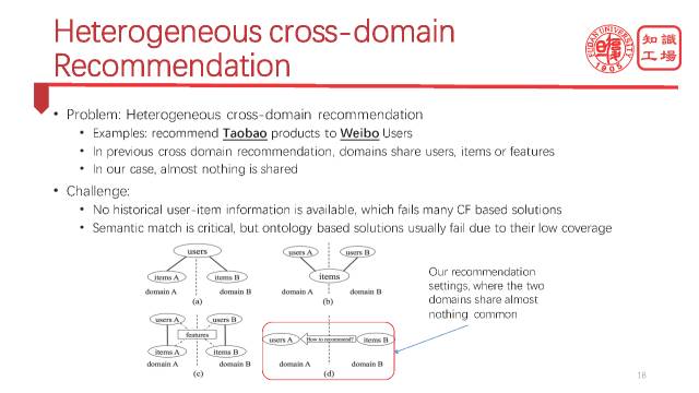 我们怎样利用这个知识图谱来做一些精准推荐呢?在推荐中最难的一类是跨领域推荐,不同的领域要不共有user,要不共有item,要不共有feature,可是也有非常情况,比如说给微博用户推荐淘宝商品,当然可以用传统的ontology的办法,但是ontology的覆盖率比较低,所以我们要用知识图谱。
