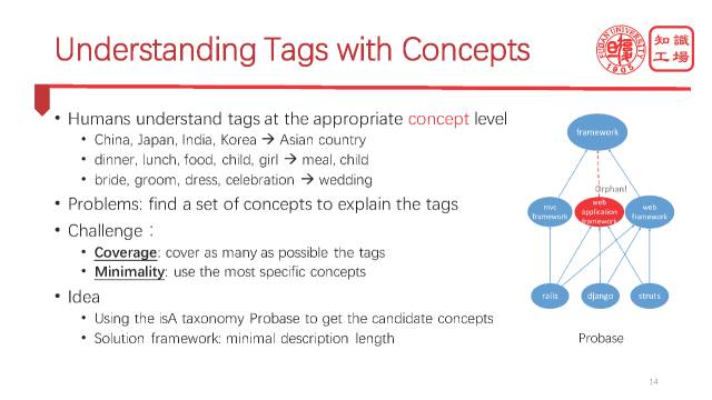 首先我们用一个knowledge base叫probase,它包含了大量的实体,也可以认为是标签及其概念。比如“apple”,它可以是一个company,也可以是一个fruit,company和fruit都是“apple”的概念。