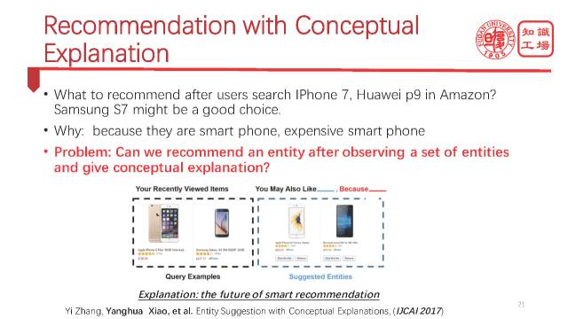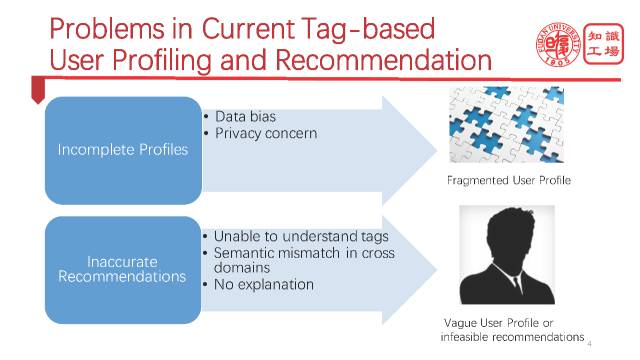 用户画像第二个关键的问题就是不正确性,也就是说我们对用户画像的理解很多时候是错误的,这导致就会出现错误的推荐。导致不正确性的原因有很多,第一个就是机器还无法理解这些标签,也就无法做出精准推荐。第二个原因就是在跨领域场景下,由于缺失用户的商品,也就是缺失推荐对象之间的历史交互信息,使得冷启动变成一个非常突出的问题,没有历史信息,一切基于这个的推荐就会失效。这个时候我们可能会采取一些基于语义的办法,但是基于语义的办法前提是要有精准的语义匹配,这就需要一个庞大精准的知识库来作为背景知识来支持。第三个原因就是没有针对推荐给出解释。这个是非常重要的,当且仅当你给出一个非常合理的解释的时候,用户才会很好的接受推荐。那如何给出解释呢?以前,解释在人脑里面,现在我们可以利用大规模知识库来产生解释,从而实现能够给出带解释的推荐给用户。