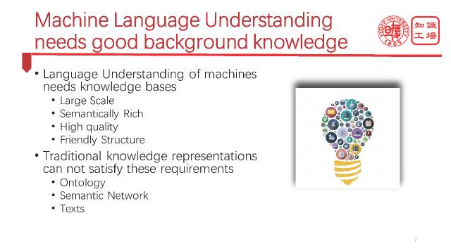 机器需要怎样的背景知识呢?第一个是要有足够大的规模,必须覆盖足够多的实体,足够多的概念。第二个是语义要足够丰富,当说到各种各样的关系的时候,机器必须都能够理解。第三个就是质量足够精良。第四个就是结构必须足够友好。