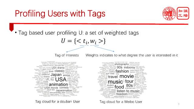 那么在各种各样的画像当中,最流行的一种方法是基于标签的。在很多实际应用中,大家都在广泛的应用这一类基于标签的画像方法。基于画像的标签方法其实很简单,就是给用户打一组标签,每个标签给一个权重,权重代表了用户在这个方面兴趣的强烈程度,如图我们给出了一个豆瓣用户的标签云,也给出了一个微博用户的标签云。不同平台的语言风格,语言体系是不完全一样的,豆瓣的语言倾向于书面化,而微博的语言倾向于碎片化,口语化。