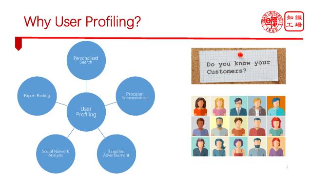 在整个互联网时代其实催生了很多基于用户画像的应用。比如搜索,百度搜索是通用搜索,因不同的人而展现不同的结果。再比如推荐,不同的人看到不同的推荐结果。广告投放,社交网络分析,甚至在企业内部找专家等等,都需要去理解用户,那么就需要一个非常有效的用户画像。