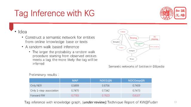 实际上我们用知识图谱是可以做到的。我们建构一个语义网络,利用CN-DBpedia把新闻里提到的候选实体之间的语义关联建立起来。我们的算法怎么实现呢?其实也很简单,我们可以用一些随机游走的办法,可以从新闻中观察到的这个实体去随机游走,看它们能都倾向于走到哪些未被观察到的实体,而这些实体就是很有可能作为标签出现的。实验结果证实这个办法的确能够找到更多人工判断下来的更为准确的标签。