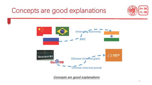 这里我们用概念作为解释,比如说,如果我说三个国家,中国,印度,巴西,然后让你再说一个国家,你很有可能就会说俄罗斯,因为它们都是金砖四国,都是新兴市场,都是发展中国家,它们共有很多概念。 所以概念是一个非常好的解释。