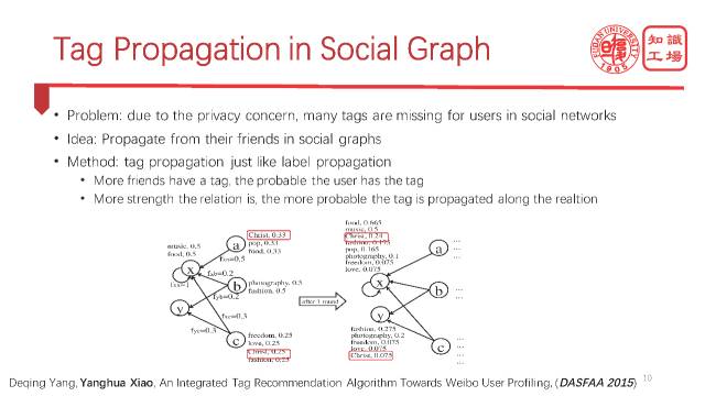比如在这个user case,基于label propagation这么一个思路,用LTPA算法,user A的real tags是music和fashion,但是通过标签传播,你会发现实际上他是一个基督教徒,因为传播出来很多类似Christian,Bible,faith等等这样的标签,那我们看他的微博发现他确实就是一个基督教徒。