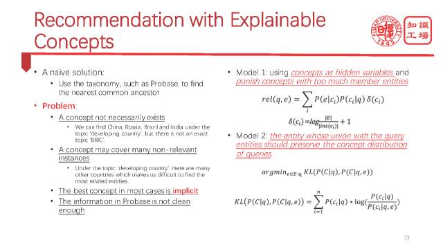 那么概念哪里来呢?概念又是来自于刚才提到的一个叫probase的知识库。那么为了做这个事情,我们提出好几个model。比如在这个model 2里面,我要推荐一个实体e,那么实体e跟刚才已经观察到的一堆实体q组合到一起之后,应该能够非常好的保持住原来那堆实体的概念分布。我们用概念分布来表示实体的语义,比如说刚才的中国,巴西,印度,他们的概念分布就是发展中国家,新兴市场,金砖四国这样一些概念。概念实际上是实体的一个非常好的语义表示。那我用概念分布来做它的语义表示。那么很显然,我要加进来的这个实体e跟q组合到一起之后,他们的概念分布要尽可能保持住已经观察到的这组实体的概念分布。就有这么一个model,我们需要把它的交叉熵给最小化。这就是我们这个model 2。下面就是求解,那就非常简单了。