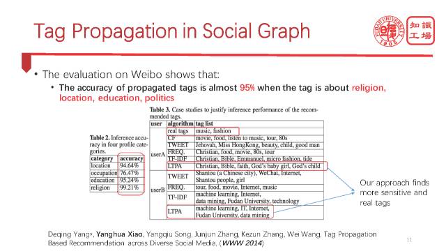 这里有一个实际案例,我们在微博上做实验,结果显示这种传播方法很有效,尤其是在宗教信仰,政治观念,教育等方面的推断准确率能高达95%。