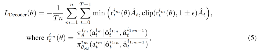 解码器的参数用θ表示,它将嵌入的联合动作 a^i_0:m−1 , m = {1, . . . n}(其中 a^i_0 是指示解码开始的任意符号)传递到解码块序列。至关重要的是,每个解码块都有一个掩码的自注意力机制。为了训练解码器,研究者将如下裁剪 PPO 目标最小化。
