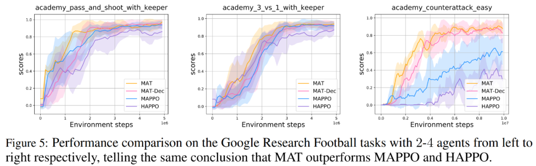 同样地,研究者在 Google Research Football 基准上也得到了类似的性能结果,如下图 5 所示。