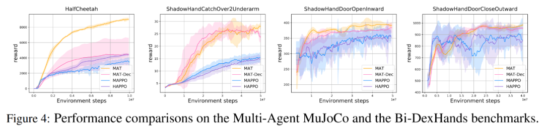 如下表 1 和图 4 所示,对于 SMAC、多智能体 MuJoCo 和 Bi-DexHands 基准来说,MAT 在几乎所有任务上都显著优于 MAPPO 和 HAPPO,表明它在同构和异构智能体任务上强大的构建能力。此外,MAT 还得到了优于 MAT-Dec 的性能,表明了 MAT 设计中解码器架构的重要性。