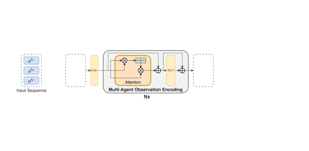 基于定理 (1) 中描述的序列属性以及 HAPPO 背后的原理,现在可以直观地考虑用 Transformer 模型来实现多智能体信任域学习。通过将一个智能体团队视作一个序列,Transformer 架构允许建模具有可变数量和类型的智能体团队,同时可以避免 MAPPO/HAPPO 的缺点。