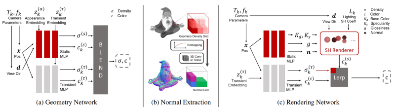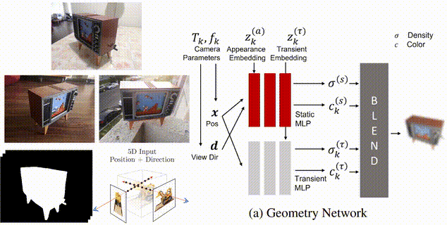 首先,(a)网络获取的是物体的几何形状,这是与NeRF最相似的部分,文中称为几何网络(Geometry Network)。它将输入图像、分割遮罩和相机参数估计结合起来建立一个辐射场,并找到每个像素的密度和颜色的猜测结果,整体流程和NeRF基本相同,但新模型需要适应输入图像中不同的照明条件。