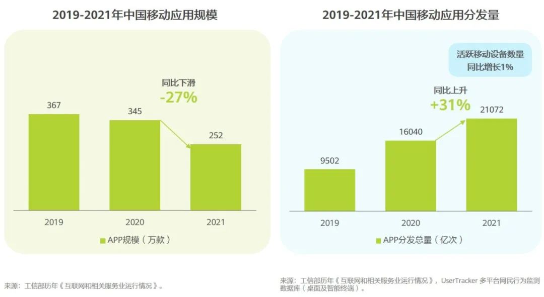 近两年无论是中国智能手机市场,还是整体移动应用数量皆出现持续下滑,白皮书数据显示,2021年国内应用数量下降幅度更是高达27%。同时,移动应用分发量同比提升幅度为31%,疫情持续推动用户对在线移动应用服务的需求快速增长。