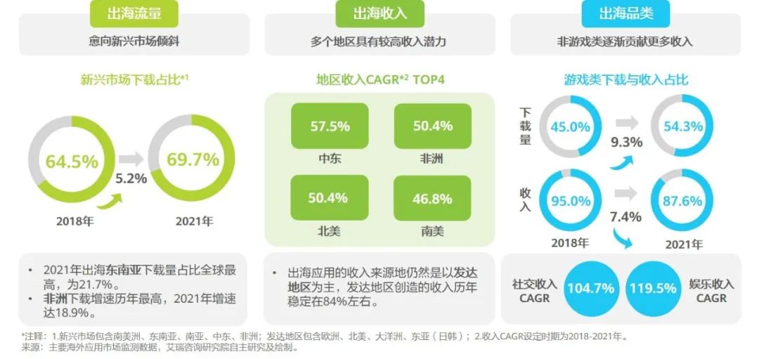 我国出海应用在新兴市场下载量增长显著,获量多来自东南亚与南亚。在出海收入方面,中东、非洲、北美地区在2018年至2021年的收入年复合增长率在50%以上,表明应用出海具有很大的收入潜力。其中,社交、娱乐类应用收入表现尤为瞩目。