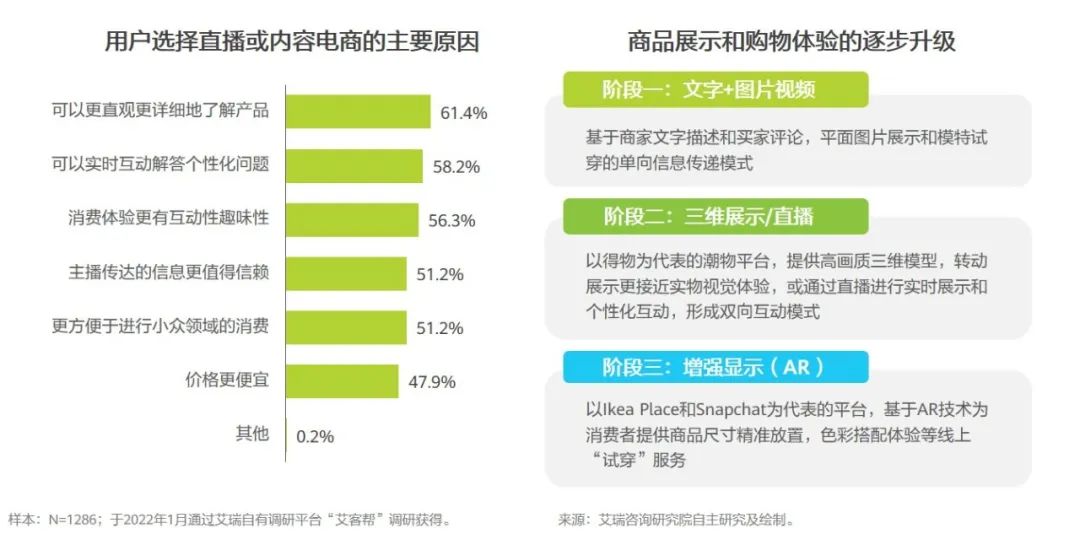 2021年在电商领域的创新更是层出不穷。在应用功能方面,从图文到视频/直播展示,再到三维展示和增强显示(AR),商品视觉展示不断升级。以Ikea Place和Snapchat为代表的平台,基于AR技术为消费者提供商品尺寸精准放置,色彩搭配体验等线上“试穿”服务。在用户需求方面,白皮书数据显示,2021年,直播/内容电商已经成为极为重要的电商模式。61.4%的用户认为直播电商或内容电商能更好实现对产品的直观感受和全面了解。