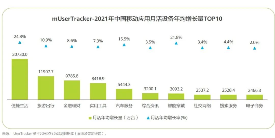 2021年用户规模增速前三的应用类型则为便捷生活、智能穿戴和汽车服务,增长率分别为24.8%、21.8%和15.5%。其中,汽车服务应用渗透率为25.5%,智能穿戴应用渗透率为10.3%,是技术高速发展背景下,低渗透高增长的潜力市场。