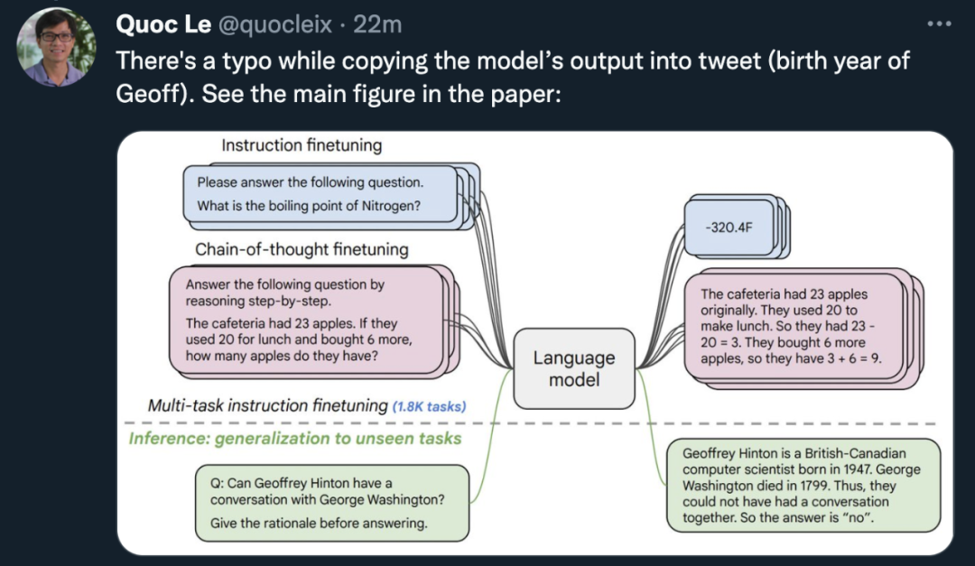 论文作者之一的谷歌大脑首席科学家 Quoc Le 赶紧出来圆场:是临时工图片做错了,在论文里 Flan-T5 模型其实没有把 Geoff 的出生年月搞错,有图为证。
