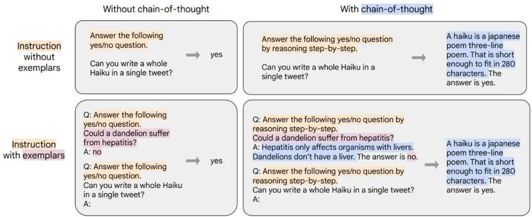 该研究发现对 CoT 数据进行指令微调的另外一个好处是可以实现零样本(zero-shot)推理,模型在没有针对 CoT 的少量样本的情况下就自行产生了推理能力,这可能需要大量工程调教才能正确实现。