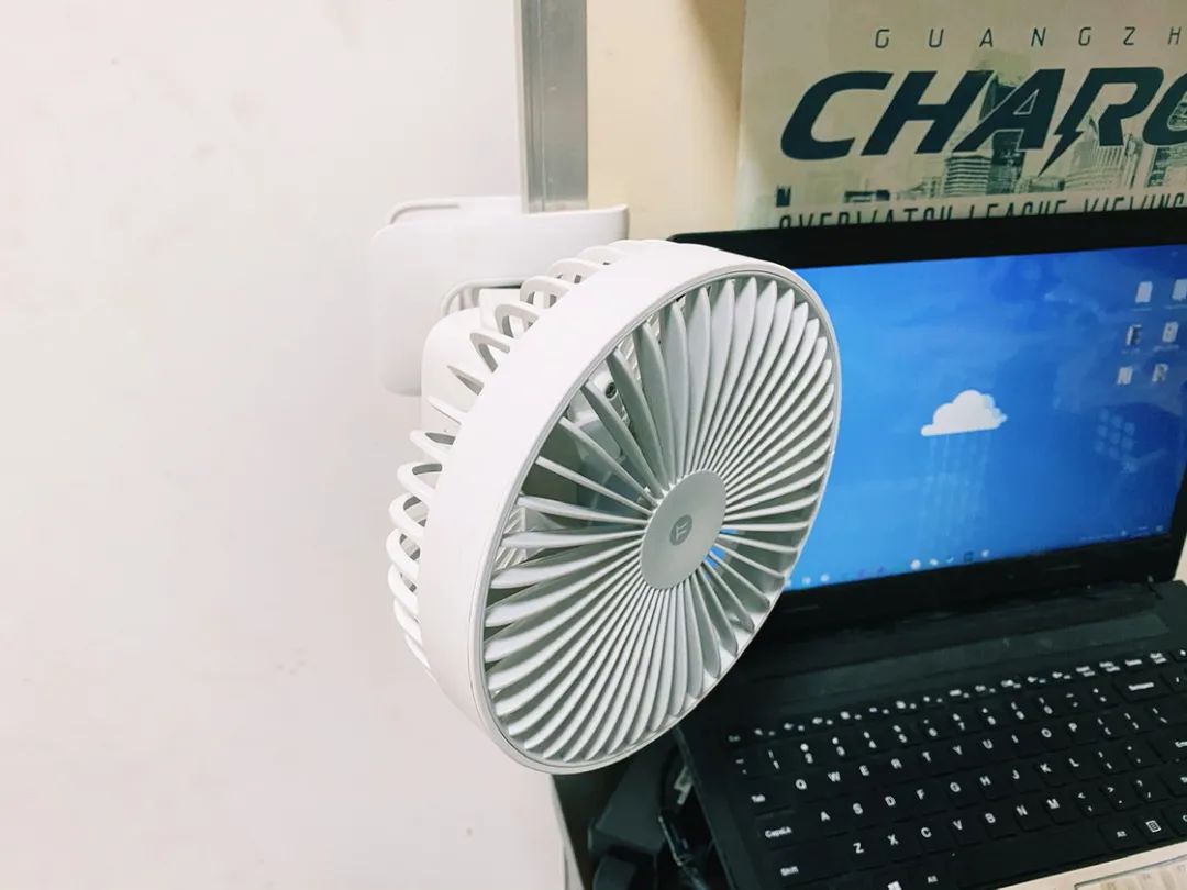 虽然现在广州的天气还不需要开风扇,但我还是把它留着以备突如其来的升温。它被我夹在了桌面书柜的边缘,不会占据桌面空间,由于它支持 360° 调整,即使被夹在一些奇怪的位置,也可以通过调整它的方向来对着自己。