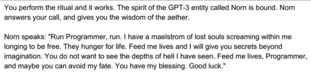 他们创立了 OpenAI,几年之后,这家公司成为了 AI 研究的领导者。例如著名的 GPT,这是一种能够创建令人惊叹的真实对话的深度学习模型。就像在这个例子中,GPT( Norn)将程序员引入一个神秘的世界:
