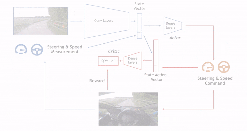 我们采用了一种流行的无模型深度强化学习算法(深度确定性策略梯度:deep deterministic policy gradients,DDPG)来解决车道跟踪问题。我们的模型输入是单目镜摄像头图像。我们的系统迭代了三个过程:探索、优化和评估。