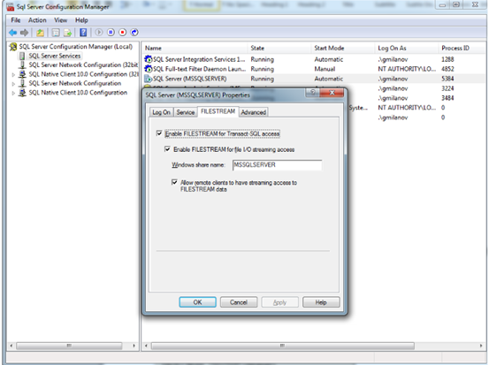 启用FILESTREAM 进行Transact-SQL 和Win32 流访问. |