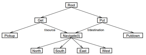 HAM的意思是分层抽象机,核心思想是通过先验知识设计状态机,降低MDP复杂度,再求解简化MDP的最优策略,也是典型的multi-level control。这里引入了状态机的几种状态:(1)Action state: 与环境交互;(2)Call state: 调用其他状态机(与option类似);(3)Choice state: 非确定地选择当前状态机的下一状态(需要学习的部分);(4)Stop state: 终止当前状态机,返回到调用的地方。具体的学习算法也是Q-learning,不同的是将环境状态和状态机状态增广为新的状态空间,来学习使用当前状态机的哪种做法可以获得更好的reward。