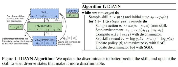 DIAYN的全称是Diversity is All You Need,这篇属于基于互信息的skill discovery,是目前比较火的研究方向,基于互信息的skill discovery的思路一般是基于某些互信息的目标函数学到skill的dynamic,或者说是skill与state的分布,这是无需环境reward支持的,然后将这些学好的skill用到其他应用中,比如作为hierarchical RL的下层policy,这篇文章也是这个思路。