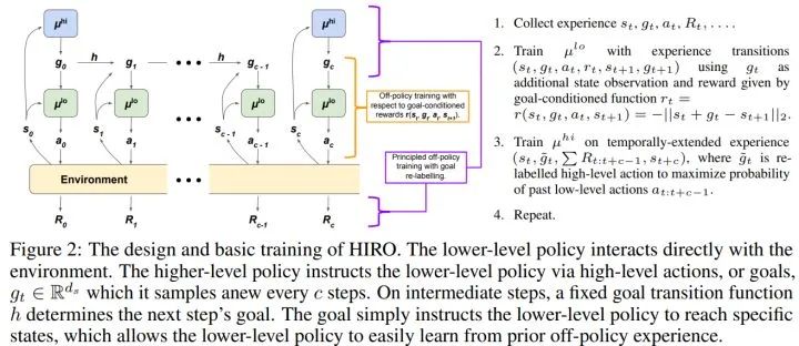 HIRO的全称是HIerarchical Reinforcement learning with Off-policy correction,本文关注off-policy下high/low level non-stationary的问题,off-policy本来就十分不稳定,很多算法采用很多技术才减弱了不稳定性,除此之外在HRL下也有它特有的不稳定性,就是上下层策略的不稳定性,HAC中是通过HER来解决这个问题的。