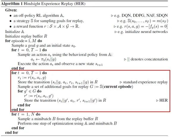 这一篇是建立在UVFA基础上的,hindsight是事后诸葛亮的意思,点明了本文算法的核心思想。本文解决的是reward稀疏和goal选取困难的问题,方法另辟蹊径,读完让人眼前一亮。由于reward稀疏,必然会导致很多条完整的transition都无法达到预设的goal,于是产生了很多失败的transition,虽然没法用于预设goal的训练,但我们可以对于每一条transition都去计算一下假如换做其他目标的话,该transition会变成什么样。