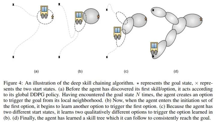 这两篇属于skill discovery范畴,但本质还是分层,第二篇在第一篇基础上使用DRL来解决。这篇提出的创新点就是以往的option需要指定其数量,option的数量是一个超参,而这里无需指定数量,agent会自动学到需要多少option。自动学习option数量通过skill chaining来实现,skill chaining的思想就是,先确定在goal附近能通过某些途径达到goal的option,将其加入一个集合,再将这个option的initial set作为下一个需要学习的option的terminate state,这样不断从后往前推直到遇到全局的初始state,这样所有option连起来就形成了一条skill chain,可以解决goal的问题。虽然这些option是首尾相接的,但实际agent还是通过学习来决定选取哪一个option,并不是确定的选相连的下一个option。