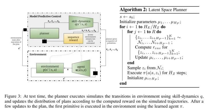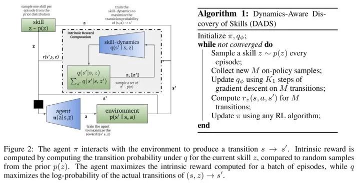 这是一篇ICLR2020的基于互信息的skill discovery论文,文章通过在没有外界reward支持的无监督学习条件下,通过发现具有可预测性的skill并学习skill的dynamic,获取多个专注不同领域的skill,然后通过模型预测控制(MPC),直接基于已学好的模型做planning。本文整体的思路和DIAYN一致,都是通过最大化state和skill的互信息来学习skill dynamic,所不同的是本文在使用学到的skill时,采用了planning的做法,而没有像DIAYN一样又学习了一个上层的meta controller来选择调用不同的技能。具体的分析可以看下面链接。https://zhuanlan.zhihu.com/p/270147463