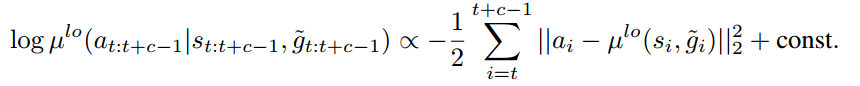 这篇文章的分层方式和FuN十分类似,都是上层产生goal,这个goal的语义是期望达到的状态与当前状态的残差,下层接受goal进行下层的控制。上层每隔c步输出一次,下层每步都输出,产生的样本放入样本池,这就导致在训练上层策略时,由于下层策略可能已经改变,不再是当初存这条样本时的样子,相同的goal下对应的c步action序列和相应的的累积reward和当初存下来的不匹配,于是产生了non-stationary的问题。为了解决这个问题,文中提出一个做法,即固定已经产生的样本的奖励不变,但是去寻找在当前条件下给一个怎样的goal可以最大可能产生以前下层策略的c步动作序列和累积奖励,这看起来有一点最大似然的意思。文中给出一个近似公式,但也无法求解,于是通过采样从10个备选的goal中选一个能让下式最大的,其中两个特殊的是原始的goal 和