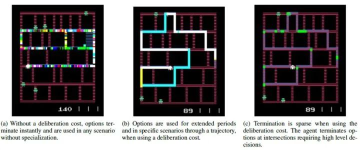 这是option-critic的作者在之后又发的一篇option相关文章,主要思想是认为option的频繁切换会影响运行效果和效率,于是在option-critic的中断函数的策略更新中增加一个惩罚值,适当地降低option的切换频率。这个结论其实在option-critic的实验部分就已经提到了,理解上也很直观,很显然,然而经过一番包装也成了一篇改进文章。文中吃豆人实验的效果非常好,可以看出加了惩罚后,agent只在适当的拐弯处才切换option。