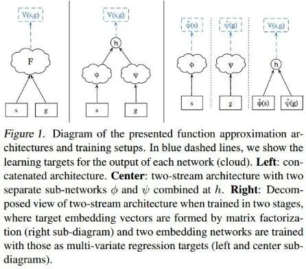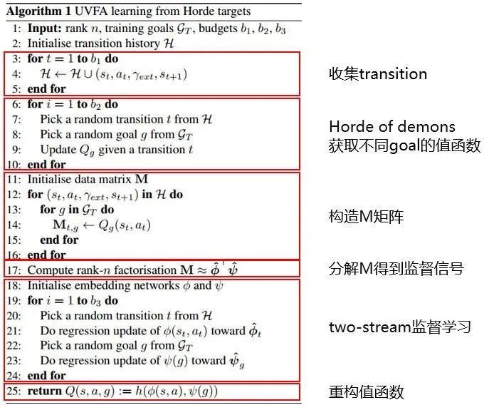 ,这样值函数就变成在某一状态(或状态动作)某一目标下的价值。将给定状态和目标映射成对应的状态目标值的方法是,分别将状态和目标过自己的神经网络,拟合出对应的隐变量,然后将两个隐变量通过某种方式结合成一个标量就产生了对应的值,文中采用的方法是向量内积。在拟合指定状态和目标的隐变量时需要使用监督学习的方法,因此必然需要label,文中使用一种Hord of demons的方式可以产生不同目标对应的状态目标值,然后通过低秩分解的方式将其分解为状态对应的隐变量和目标对应的隐变量,于是label就有了。因此,整个UVFA的算法流程就是,通过某种方法获取各个状态目标对应的价值,然后通过低秩分解将这个值拆解为状态对应的部分和目标对应的部分作为label,再利用监督学习学习状态和目标对应隐变量的函数拟合,这样以后就可以通过任意状态和目标直接拟合出对应的隐变量,最后通过向量内积整合成一个状态目标值,起到泛化作用。