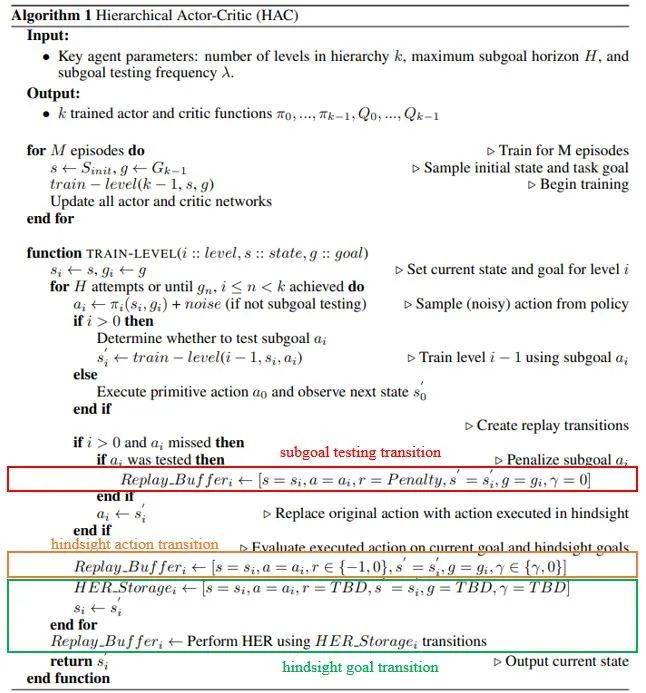 本文提出三种transition:(1)hindsight action transition,对于非最低层来说action就是选goal,或者说是选state,因此action space就是state space,如果上层设定的goal下层没达到,那就将已达到的state作为goal,相当于对上层的action做了hindsight,这样基于下层已经最优的假象进行上层的训练,从而暂时忽略掉下层policy的变化,这部分是对action的调整;(2)hindsight goal transition,这个就是原始的HER所干的事情,是对goal的调整,解决reward稀疏的问题;(3)subgoal testing transition,在上述两种调整下,agent用于更新的transition都是可到达的一些state,对于一些较远的目标,可能无法实现,因此以一定概率进行测试下层policy能否实现当前goal,当goal无法被下层完成时,即给出不切实际的遥远goal时,给以惩罚。