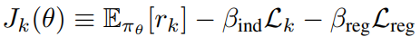 下面式子是需要最大化的目标函数,第一项代表策略获得的reward,与需要从当前state中获取信息的量成正比,信息量通过策略生成的隐变量与标准高斯分布的KL散度来衡量,这一项代表策略间的竞争;第二项是正则项,就是前面的KL散度,使当前策略不要无限制地从state中攫取信息;第三项是entropy的正则项,使各策略不要坍塌到一个策略上,保证多样性。