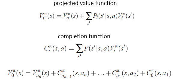 本文的思想是对任务进行值函数分解,分解为多个子任务,每个子任务对应一个MDP。QMIX是对不同agent的Q进行分解,本文是对不同子任务进行Q分解,属于multi-level control。算法公式就是值函数的贝尔曼方程,一层一层向下分解就能写成所有子任务值的迭代和形式,可以把选取某个子任务看成传统的选择与环境互动的动作。优化方法和一般的Q-learning是一样的。