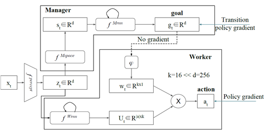 之前介绍过Feudal,本文就是将Feudal的思想DRL化。将层次结构分为manager和worker,通过前面这些文章的总结,可以知道上层的控制器有两种控制选择:一种是选择不同的下层控制器来执行,比如option就是这种做法;另一种就是选取合适的goal来让下层控制器实现,上面的h-DQN就是这种。本文的做法是第二种,但创新在这个goal是自动生成的。文中将神经网络的隐层state作为goal,赋予这个隐变量的语义就是当前state在低维空间中所要改变的方向。worker的reward就顺理成章地变为前后两个step下state向量的变化方向与这个象征正确变化方向的goal的余弦相似度。