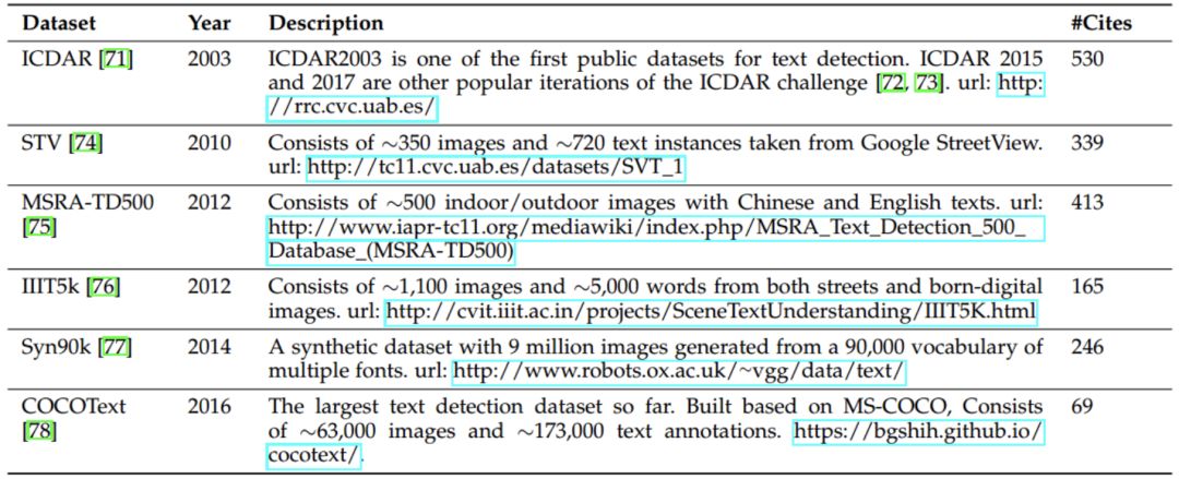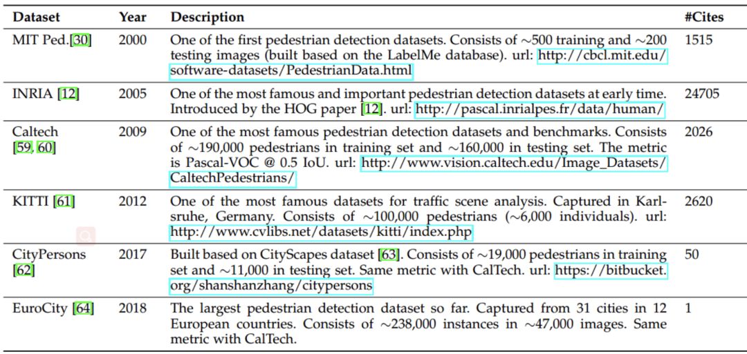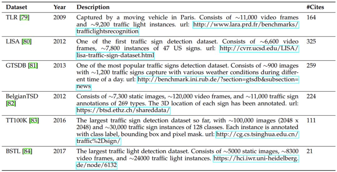 在过去的20年里,除了一般的目标检测外,在行人检测、人脸检测、文本检测、交通标志/灯光检测、遥感目标检测等特定领域的检测应用也十分繁荣。下面一系列表列出了这些检测任务的一些流行数据集。有关这些任务的检测方法的详细介绍可在后期分享中找到。